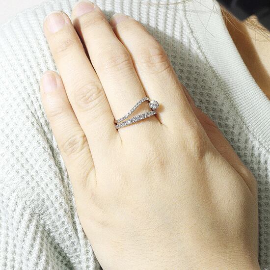 一粒ダイヤを指の脇に挟むように付けると、重ね付けをしているような雰囲気。0.15ctのダイヤモンドがより輝き、美しさをさらに引き立たせます。