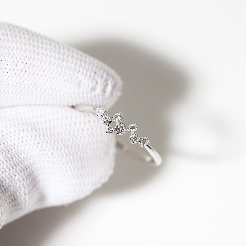 ネックレスと同様、大小8石のダイヤモンドがランダムに散りばめられたリング。