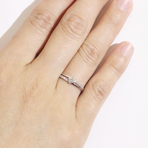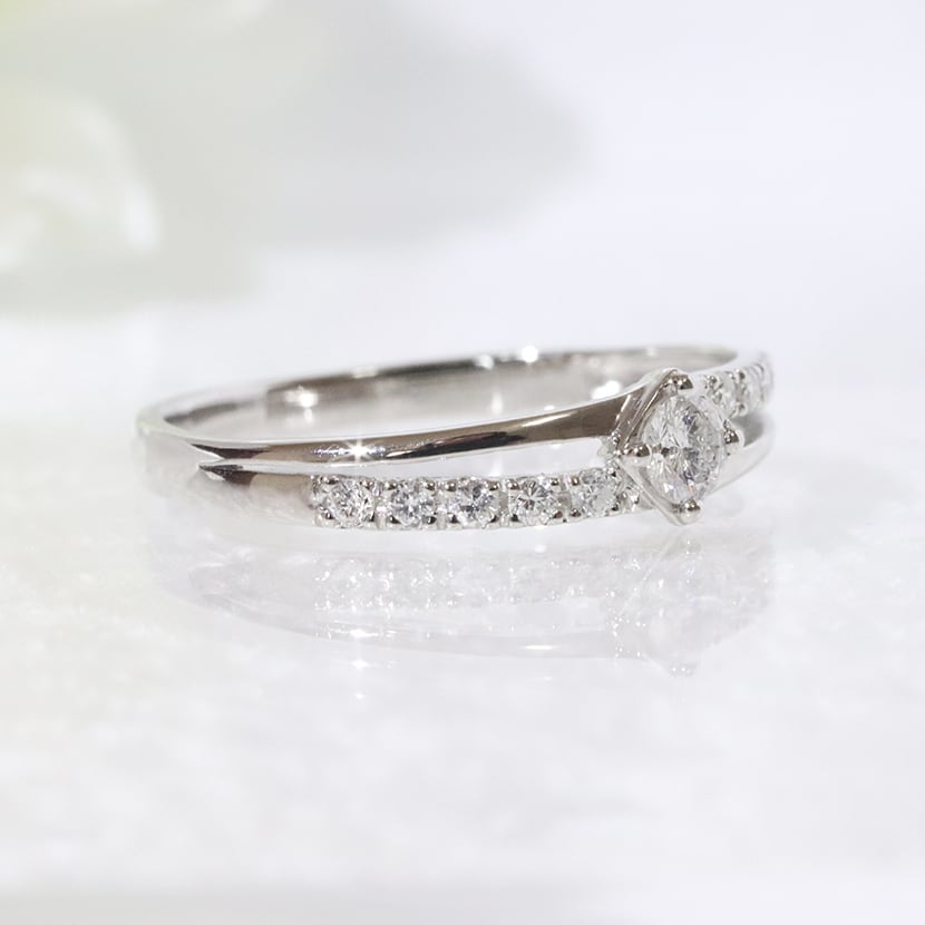 重なり合うプラチナアームに合計0.2カラットの天然ダイヤモンドをセット。