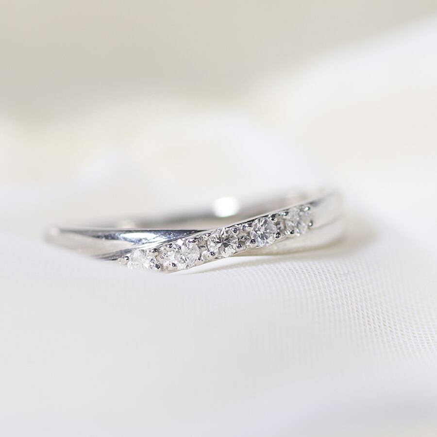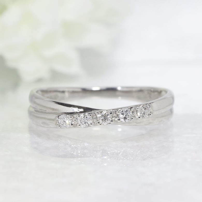 センターで重なるアームがクロスを作り、片側だけにダイヤモンドをセッティングしたアシンメトリーな仕上がり